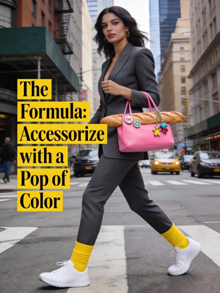 3. The Formula: Accessorize with a Pop of Color Not ready to go full-on hue? Start small. This is about injecting that playful energy with a single, statement accessory. Think a baguette bag in bubblegum, a pair of slouchy socks peeking out of your sneakers, or customizing your tote bag with enamel pins and kitschy charms. These details are like a wink to the trend—a low-commitment way to show you’re in the know and bring a jolt of fun to even the most basic outfit.
