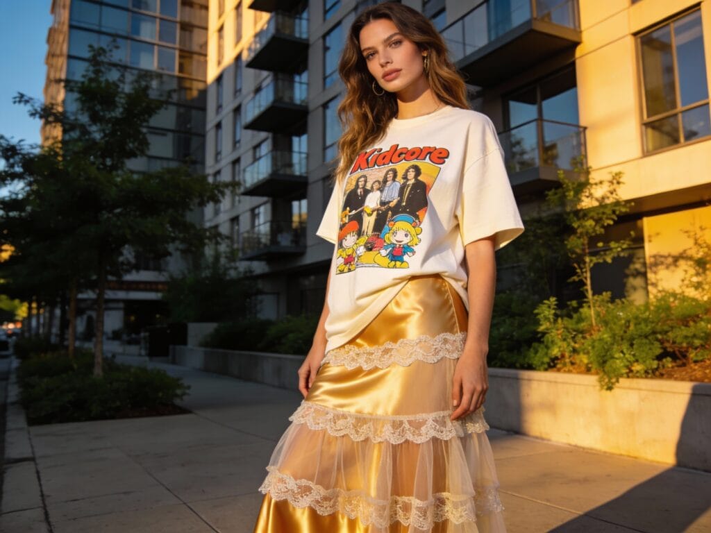 2. The Formula: Oversized Graphic Tee + Luxe Skirt This is how you wear that “sticker feeling.” Dig out your favorite oversized graphic tee (bonus points for vintage band tees or playful Kidcore cartoons). Then, instead of jeans, pair it with a ridiculously feminine skirt—a lace-trimmed midi, a tiered tulle piece, or a silky slip skirt. The silhouette is key: the oversized top creates a slouchy, effortless vibe that says you just threw this amazing look together. It’s the perfect blend of casual and chic.