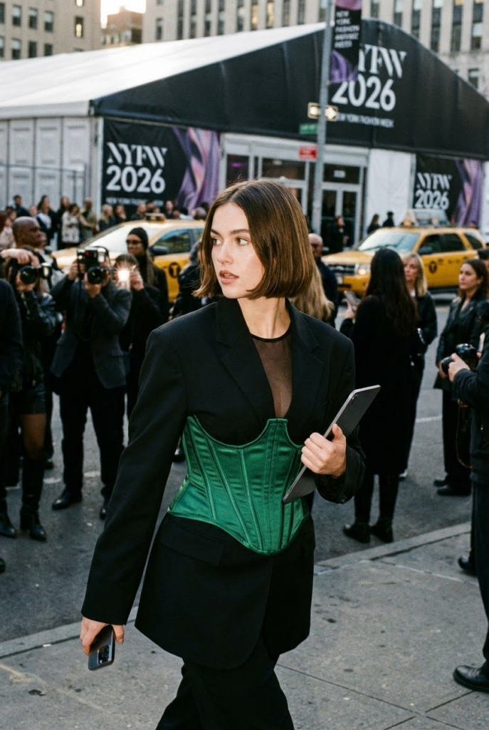 - The Vibe: Soft… with teeth. The delicate sheer top is contrasted by the rigid structure of the corset, creating a look that’s both romantic and commanding. Keeping the other pieces neutral ensures your chosen color—that brilliant cobalt or rich emerald—truly owns the scene.