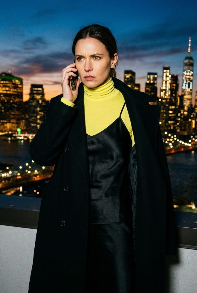 - The Vibe: This is pure cinematic drama. The unexpected pairing of a casual turtleneck under a slinky, lingerie-inspired camisole creates a stunning texture and style contrast. The bright lemon pierces through the dark, moody layers for a look that’s pure attitude.
