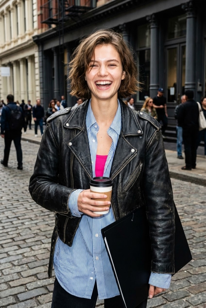 - The Vibe: This is pure, unfiltered street-style energy. The oversized shirt acts as a “movement layer,” adding a relaxed, breezy feel, while the pop of hot pink underneath keeps it playful. The leather jacket adds the necessary edge to make it feel intentional and cool.